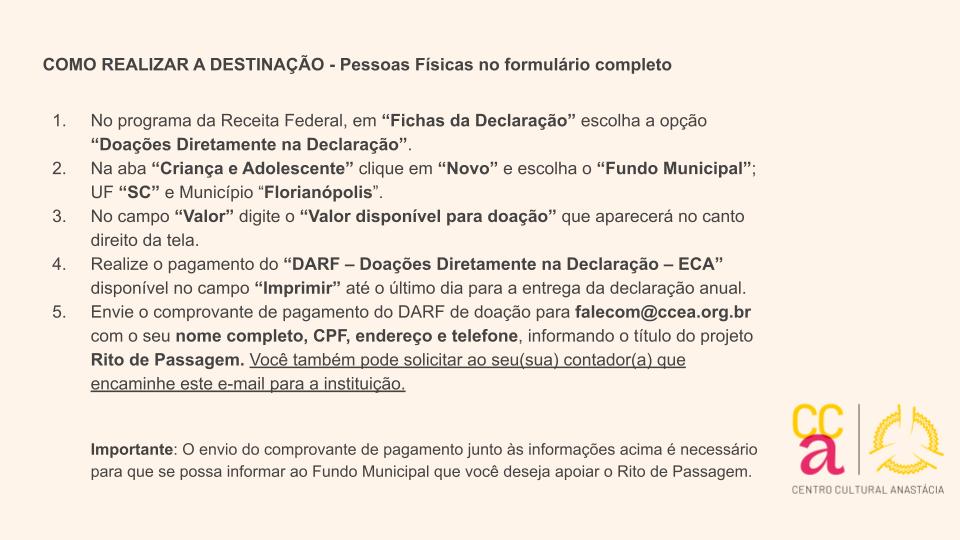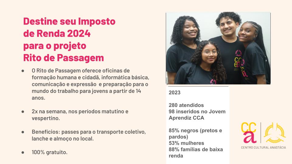 O Rito de Passagem busca promover o protagonismo de adolescentes e jovens, intensificando o exercício do pensamento autônomo e crítico necessários para inserção social, laboral e cultural, buscando seu empoderamento e desenvolvimento de suas potencialidades. As ações propostas no programa tem embasamento na experiência do CCEA na execução desse projeto, e o profundo conhecimento do público atendido. Suas ações seguem norteador próprio, no entanto, com conteúdos flexíveis às demandas dos jovens atendidos e ao momento vivenciado pela sociedade.